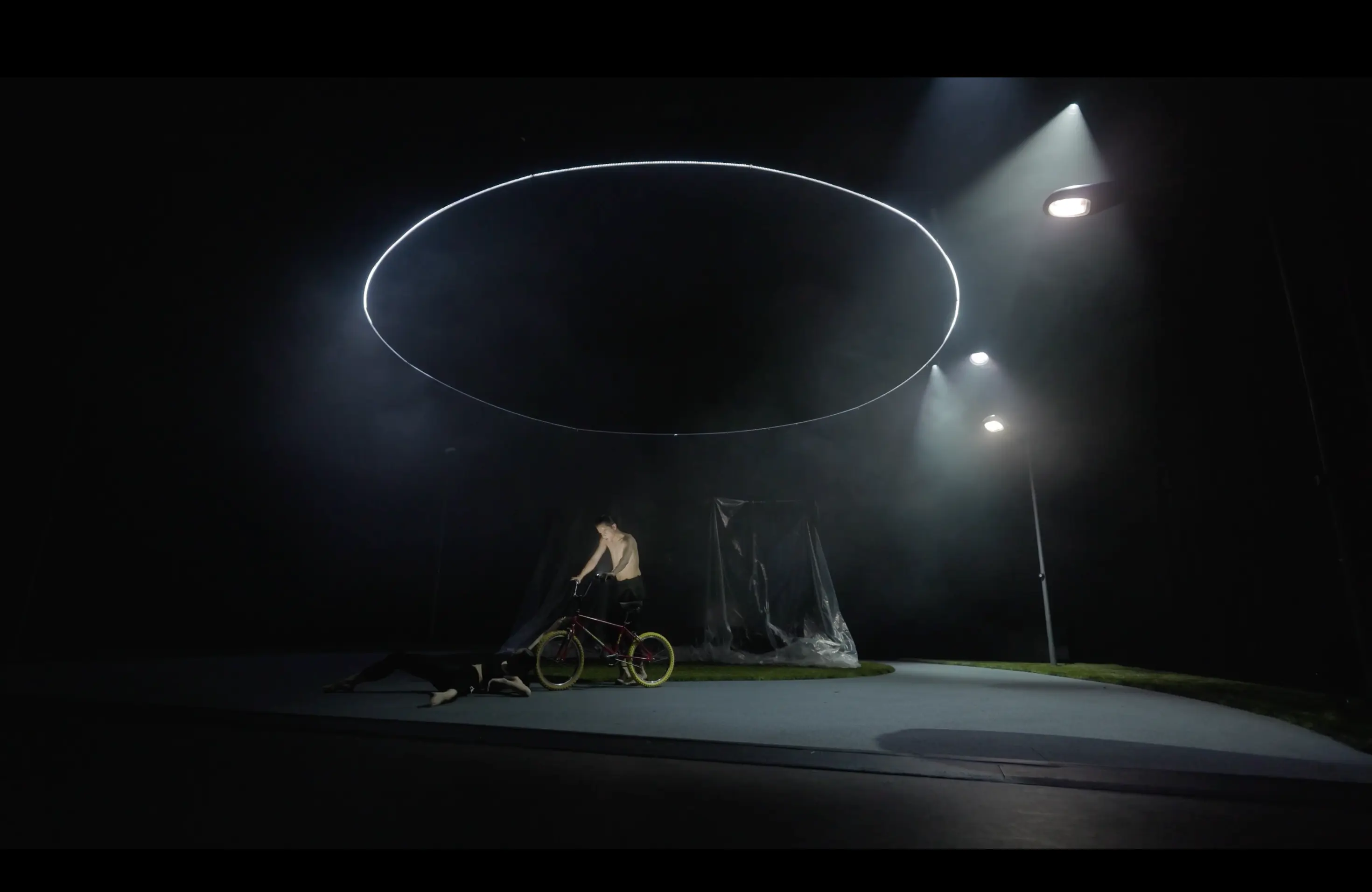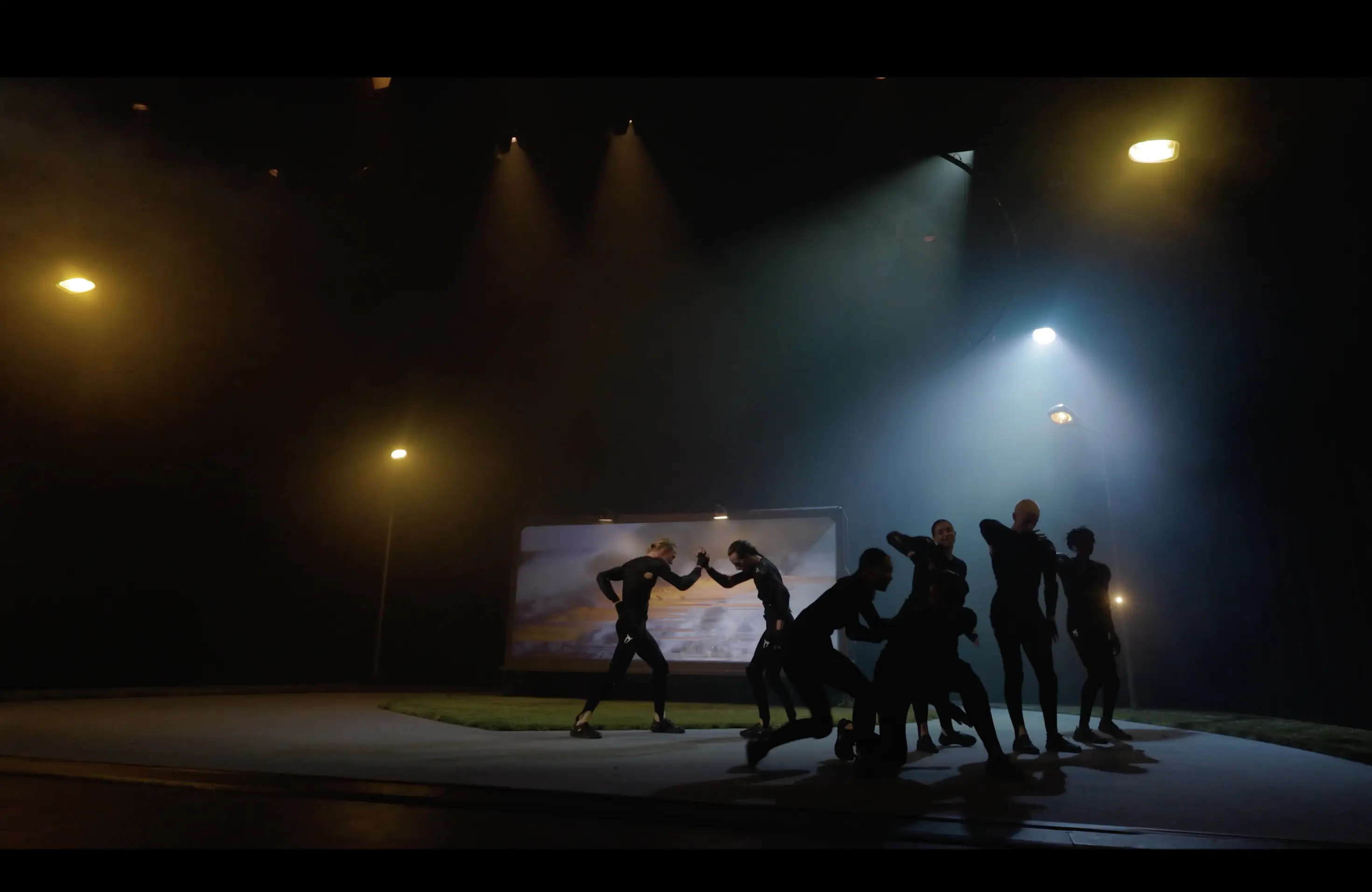 In Simulacro, our lighting design aimed to support the realism of the scenography while introducing a fictitious layer, aligned with the conceptual framework of the piece: the coexistence of multiple realities. Through special lighting executions created specifically for this production, we generated an effect-driven atmosphere, full of visual cues that echoed the music and reinforced the narrative fragmentation. Suspended above the stage, we installed a large 10 meter diameter pixel LED ring that allowed us to frame the scene from a utopian and shifting perspective. This element not only visually defined the space but also responded to the physical dynamism of the choreography, marking transitions and enhancing the energy of the dancers movements. Additionally, the ring projected light from an unusual angle, casting moving shadows created by the dancers own bodies, adding an extra, almost sculptural, visual layer that continuously transformed the perception of the space.